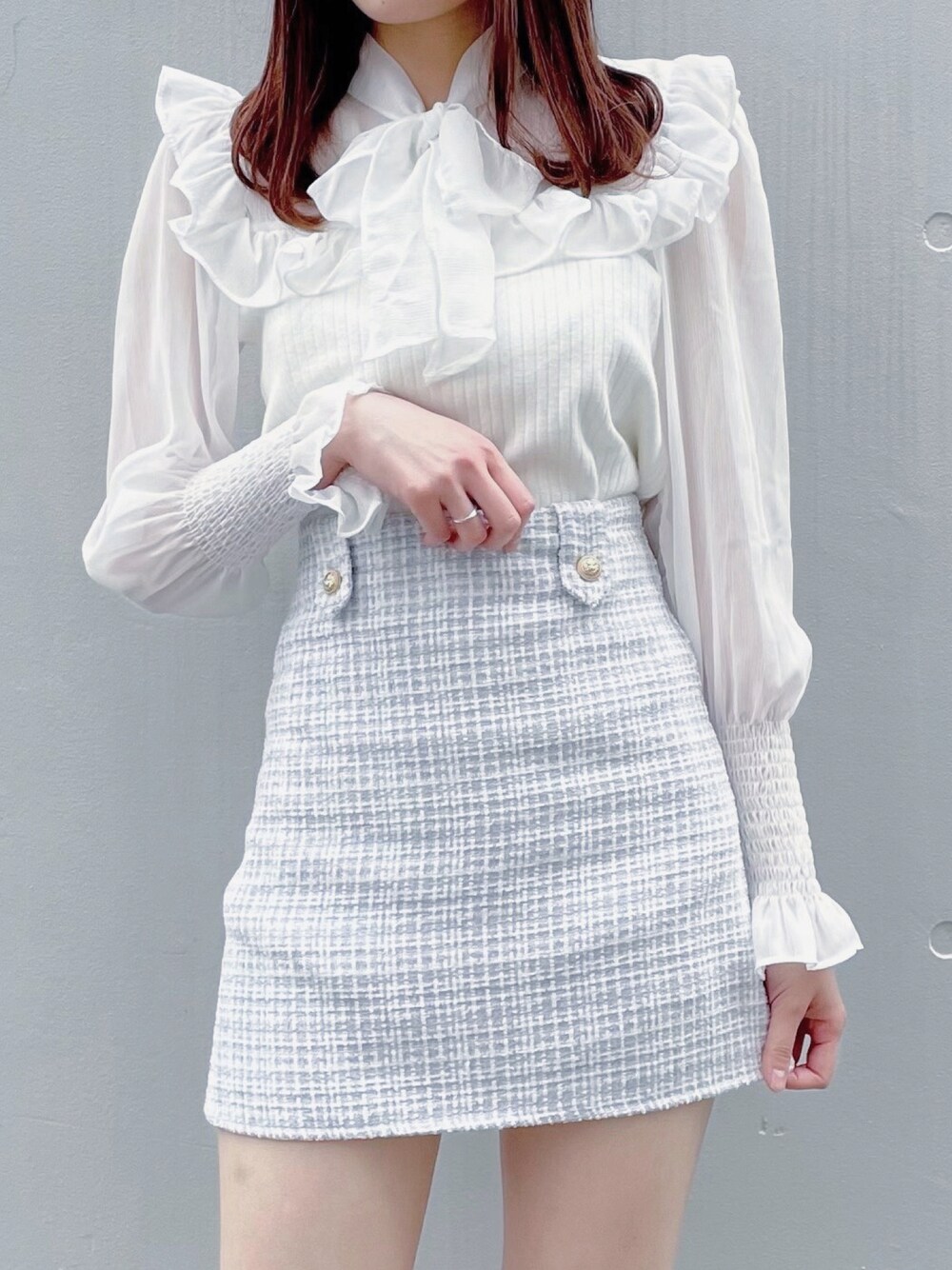 ホワイト×パステルブルーの透明感コーデ☃️ ふわふわのシフォン生地と絞ったお袖が可愛い🤍