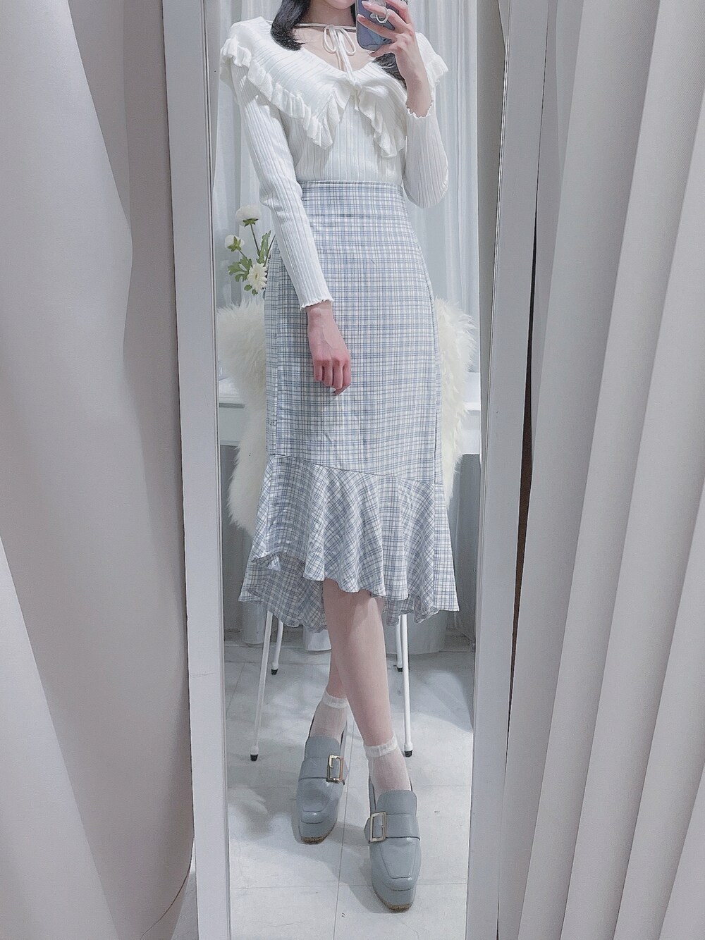ZOZOTOWNにてタイムセール中💍 淡色でまとめた綺麗めフェミニンコーデ🤍 トップスはバックリボンにしても着ていただけます💫