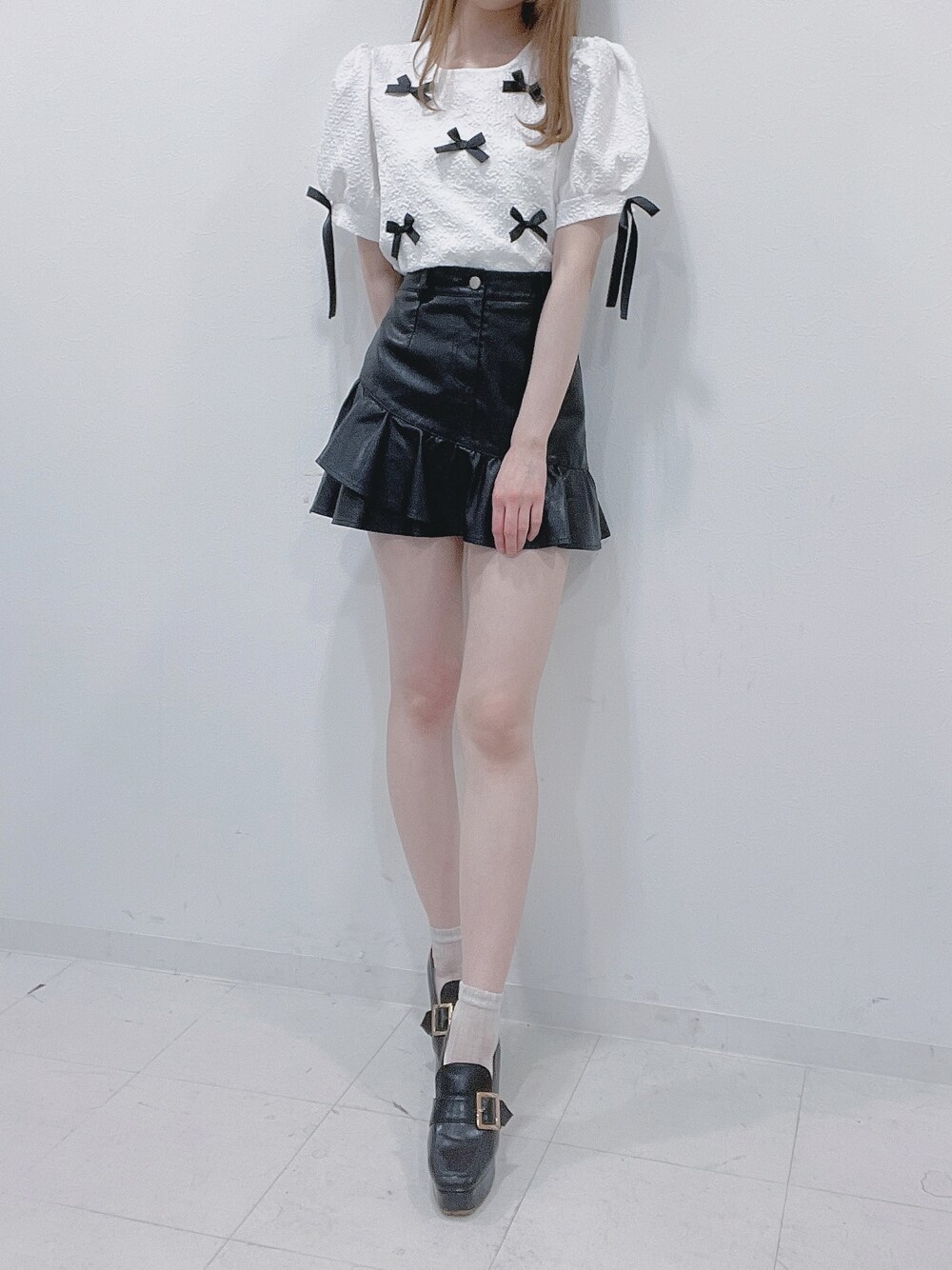 リボンたくさんの甘めトップスには 締め色にブラックのフェイクレザースカートを🖤