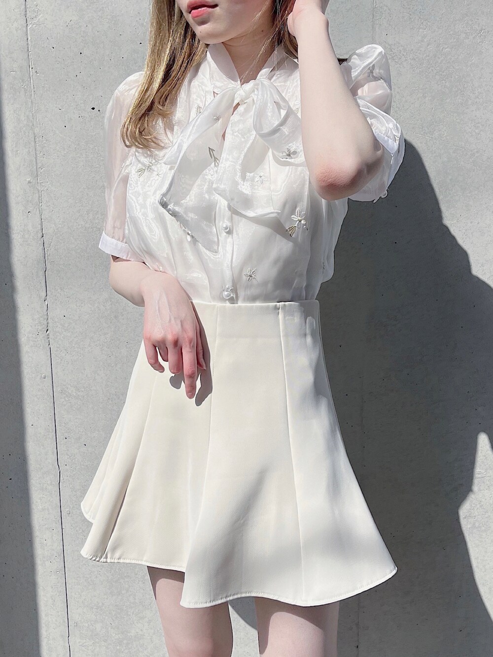 momo☁️のシャツ/ブラウス「【titty&Co.PETIT by POYO】シャイニー刺繍リボンブラウス」を使ったコーディネート