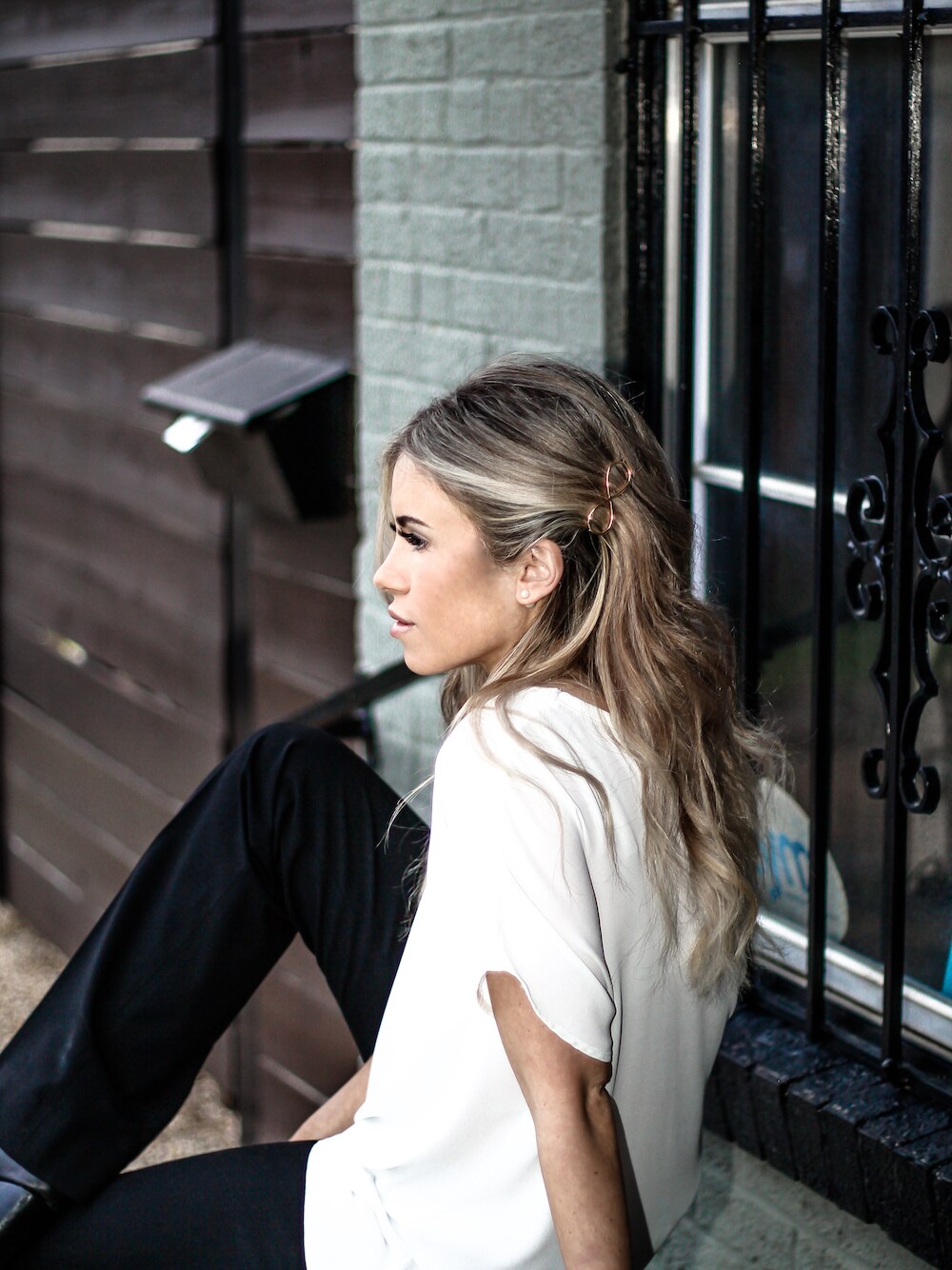Infinity barrette and silk white tee.
