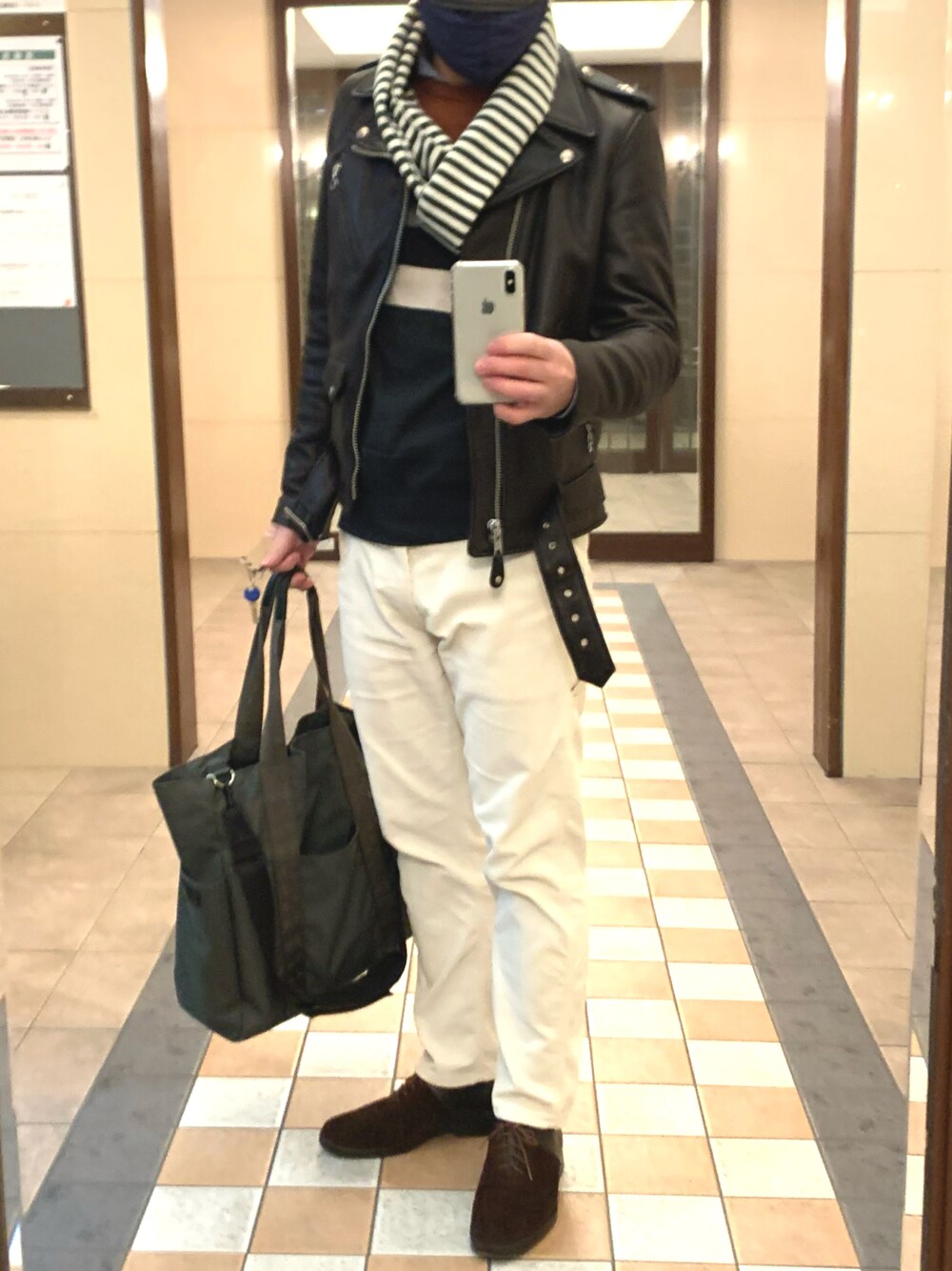 ニット自由化コーデ 定番のベタベタの上下の白のパンツに黒のライダースのベタベタの合わせてだからこそニットは自由だー! って叫んでみます。 パンツは弱フレアのオアスロウのペインターコーデュロイと少し遊びを効かしたパンツですが色の合わせ方としては特に色味もないシンプルな黒と白の上下。=ジャケットのインナーのニットは色やデザインであそびを効かせたり、色を様々な色を使用したり本当に融通の効くコーディネートです。 靴は茶色なので、ライダースの同系色であればもっと引き締まりそう! 生成りのペインターパンツと、カバン、マフラーがカーキでなので少しブラウンを差していますが、黒でいいと思います。笑 この靴はタイで一目惚れ。在庫がなくタイで店舗を探し回ったものです。トゥクトゥクに乗って全く意味もわからない場所に連れて行かれ、これは死ぬのかなぁ〜 って思ったのとこの靴の出会いは良い思い出です。
