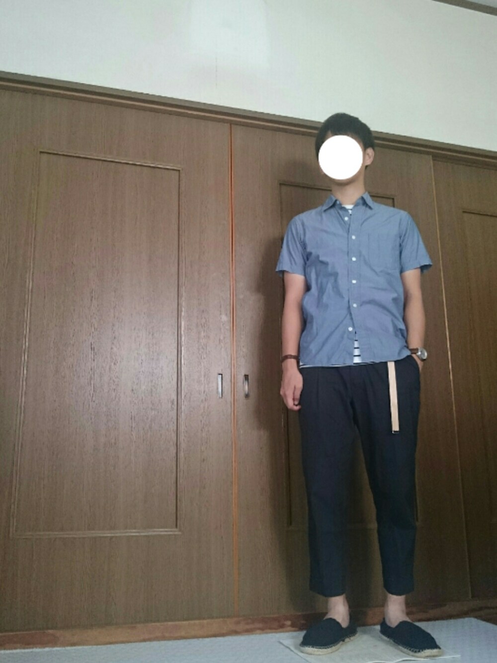 シャツ×アンクルパンツのシンプルコーデ。 ロングベルトでシンプルなコーデにアクセントを加えました。 シャツのボタンでインナーのボーダー柄がチラ見えするよう調節しています。