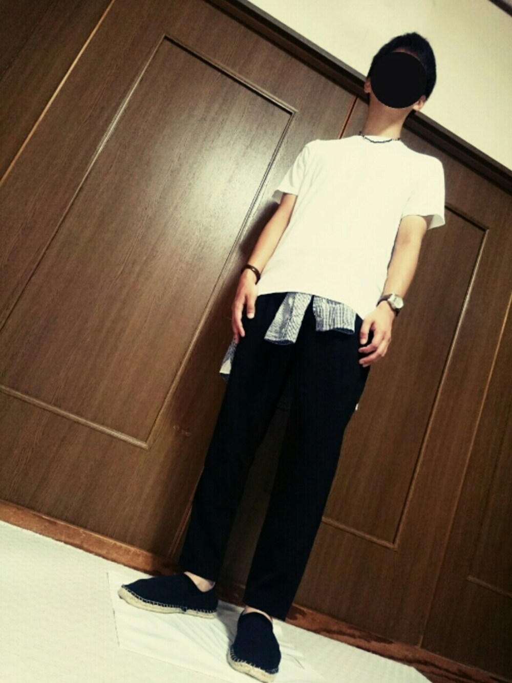 モノトーンでまとめてみました。 腰巻きにストライプシャツを使って、柄を取り入れています。