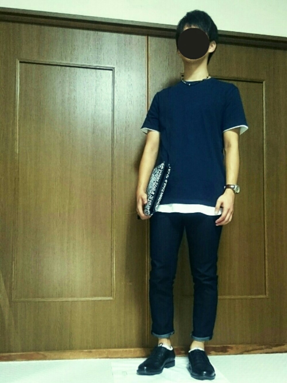 おはようございます。 今回は全身ネイビーコーデにしてみました。 Tシャツとジーンズという定番な組合せですが、色を合わせるだけで大人っぽく見える気がします。 シンプルなコーデの中に白Tをレイヤードし、柄物のクラッチバックを足して、変化を出してみました。