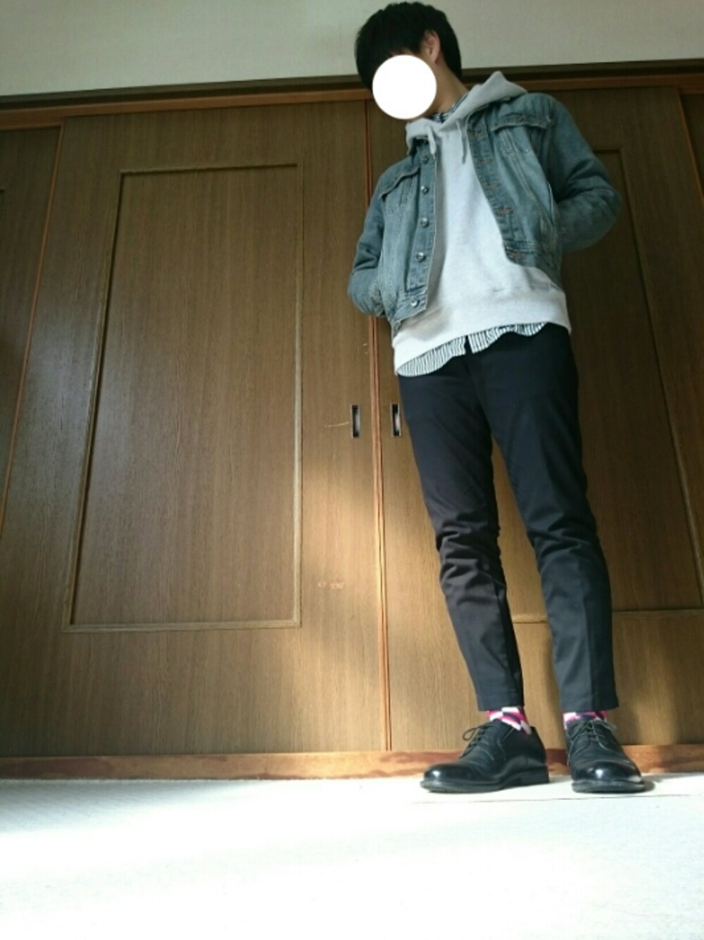 こんにちは🙋 パーカー×シャツのレイヤードスタイルにGジャンを羽織ってみました。 上をカジュアルにした分、下はスラックス調のパンツと革靴にしました。