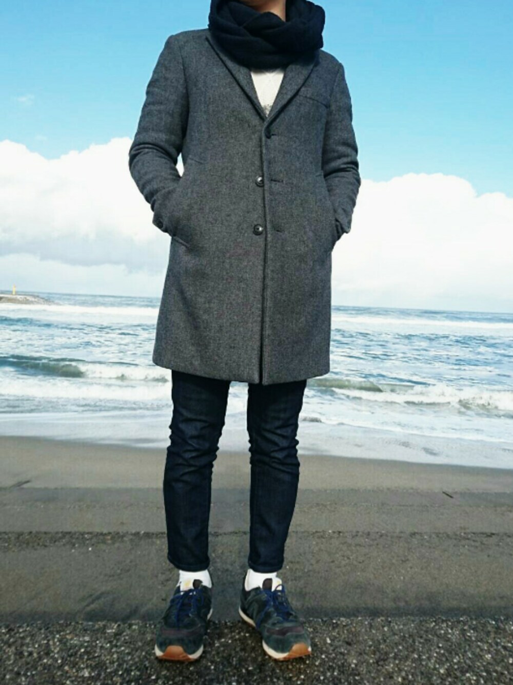 海を背にして。 チェスターコートを着たので、足下はスニーカーでカジュアルにしました。 スヌードで首は暖かいのですが、耳がすごく寒い⛄