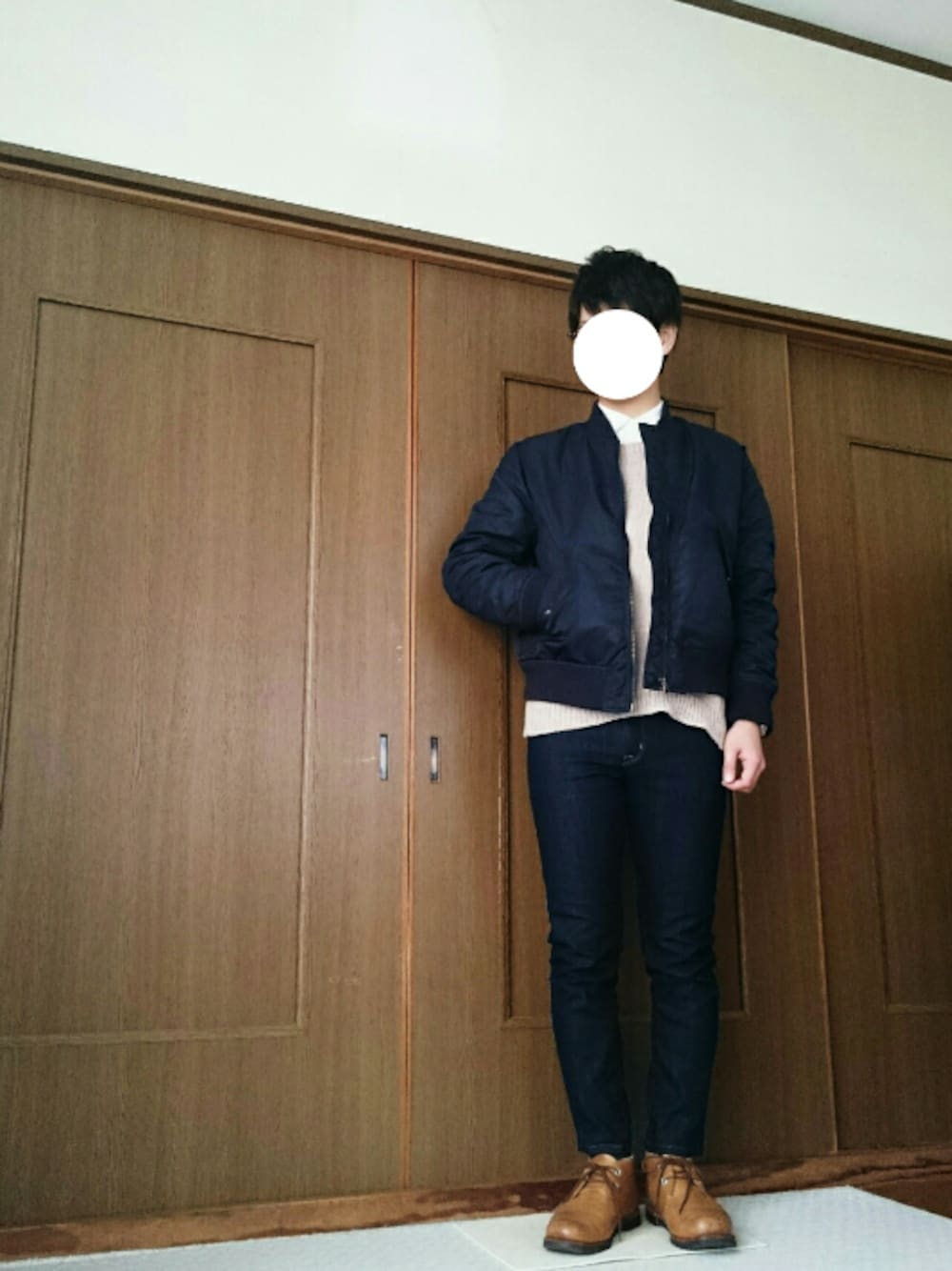 MA-1×ニットの甘辛MIX。 MA-1とジーンズの色をネイビーで合わせ統一感を持たせ、足下はブラウンのチャッカブーツでキレイめかつカジュアルに。