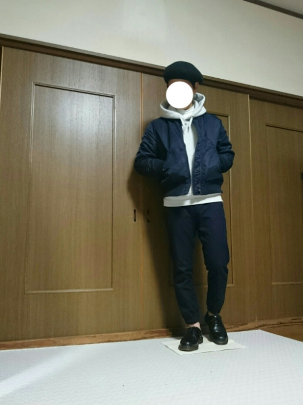 全身UNIQLOのプチプラコーデ。 カジュアルなアイテムをネイビーでまとめ、セットアップ風に。