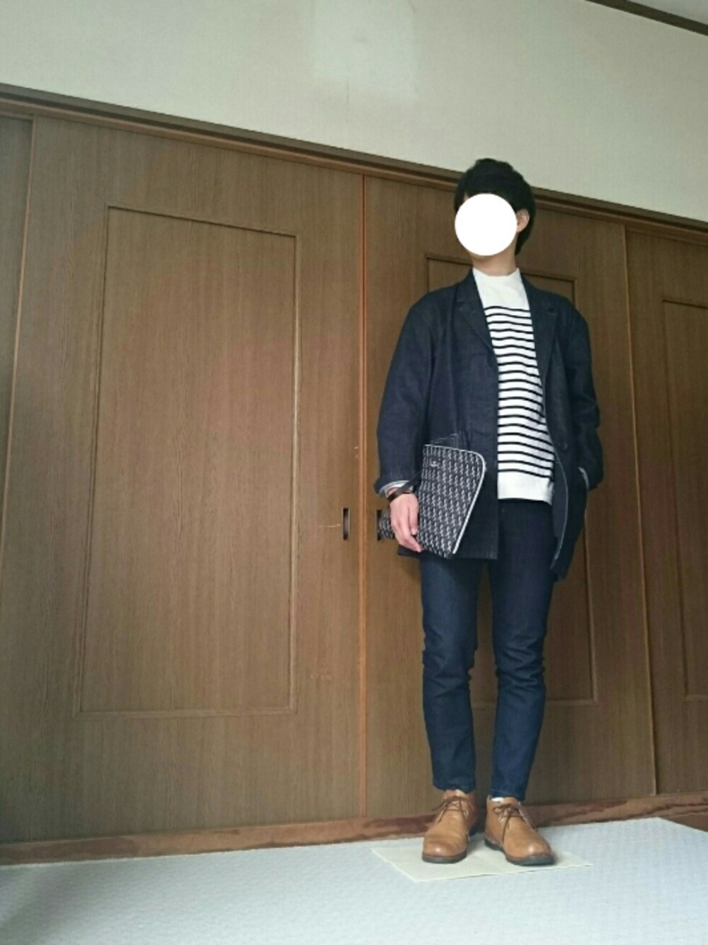 デニムでセットアップ風に。 総柄のクラッチバッグがお気に入りです。