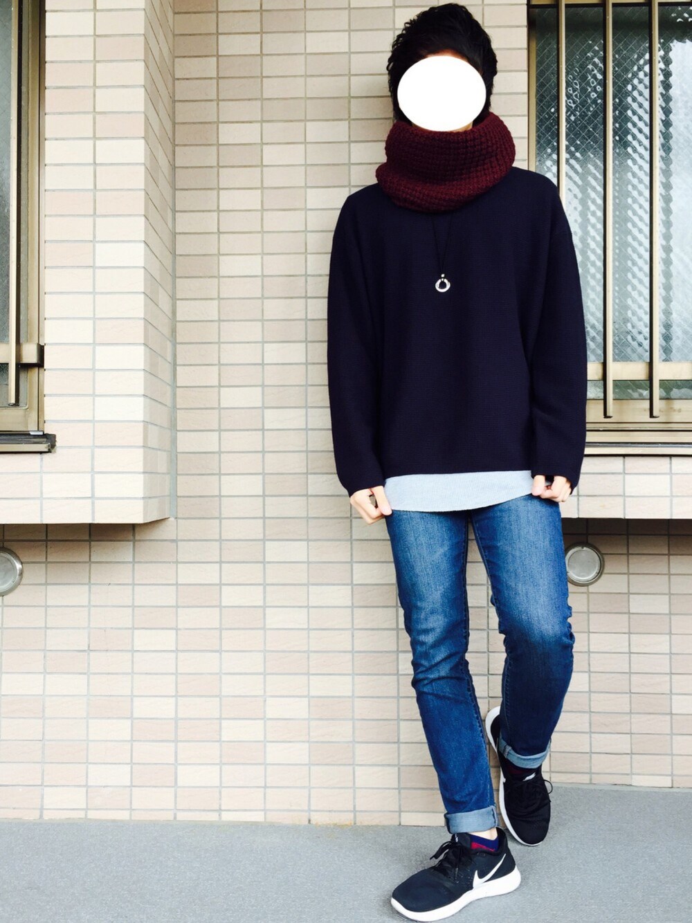 🔥ニット×スキニーデニム🔥 ダボッとしたネイビーのニットにスキニーデニムを合わせてみました! ワインレッドのスヌードを巻くことによって暖色も入り温かみのあるコーデにまとめました😊