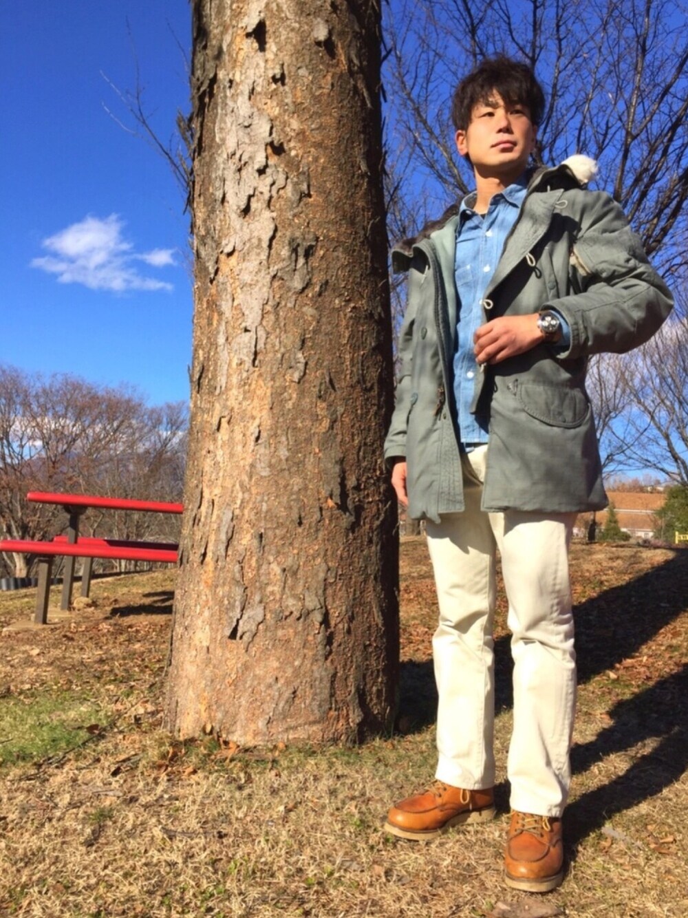 ビンテージのN3BはSサイズでもモコモコになるので、ウエスト部のドローコードを思いっきり引っ張ってます👍