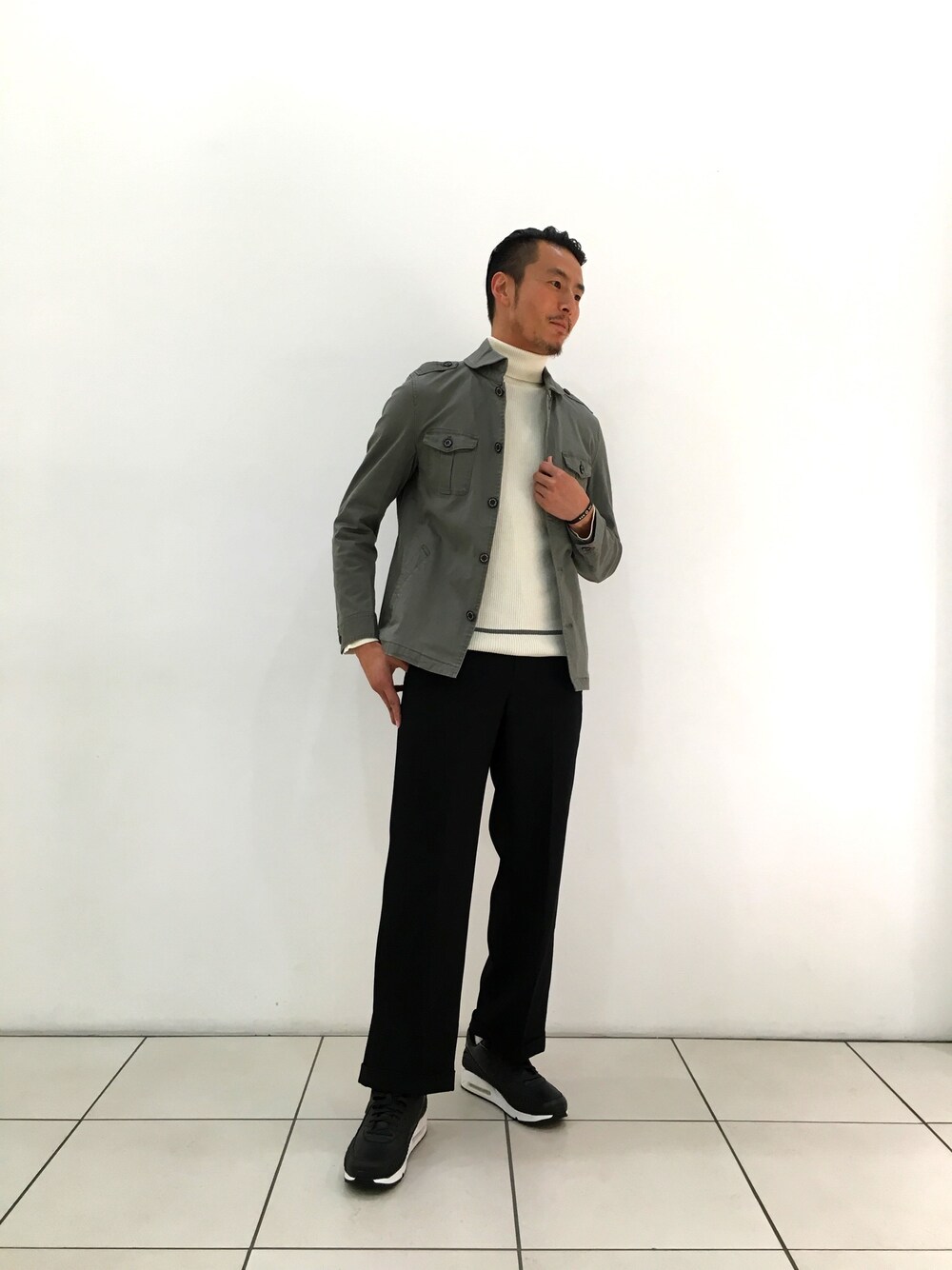 カジュアル感の強いミリタリージャケットを、 タートル&ワイドスラックスで合わせる事で、上品でトレンドを取り入れたコーディネートになります。