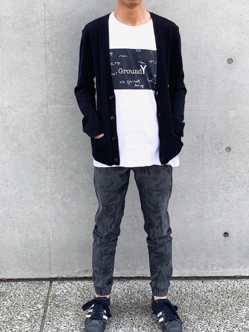 シックなスタイルの定番◎ モノトーンコーデ 黒のカーデに白インナー、 グレーボトムスのコーディネート。 足元にスニーカーを合わせて、 こなれ感のある印象に👟✨ ※ポイント ボトムは、基本的に何でも合わせやすいですが、 同色系の柄物やジョガーパンツにすると、 野暮ったさが抜けて、よりオシャレに見えると思います(^^)!💡