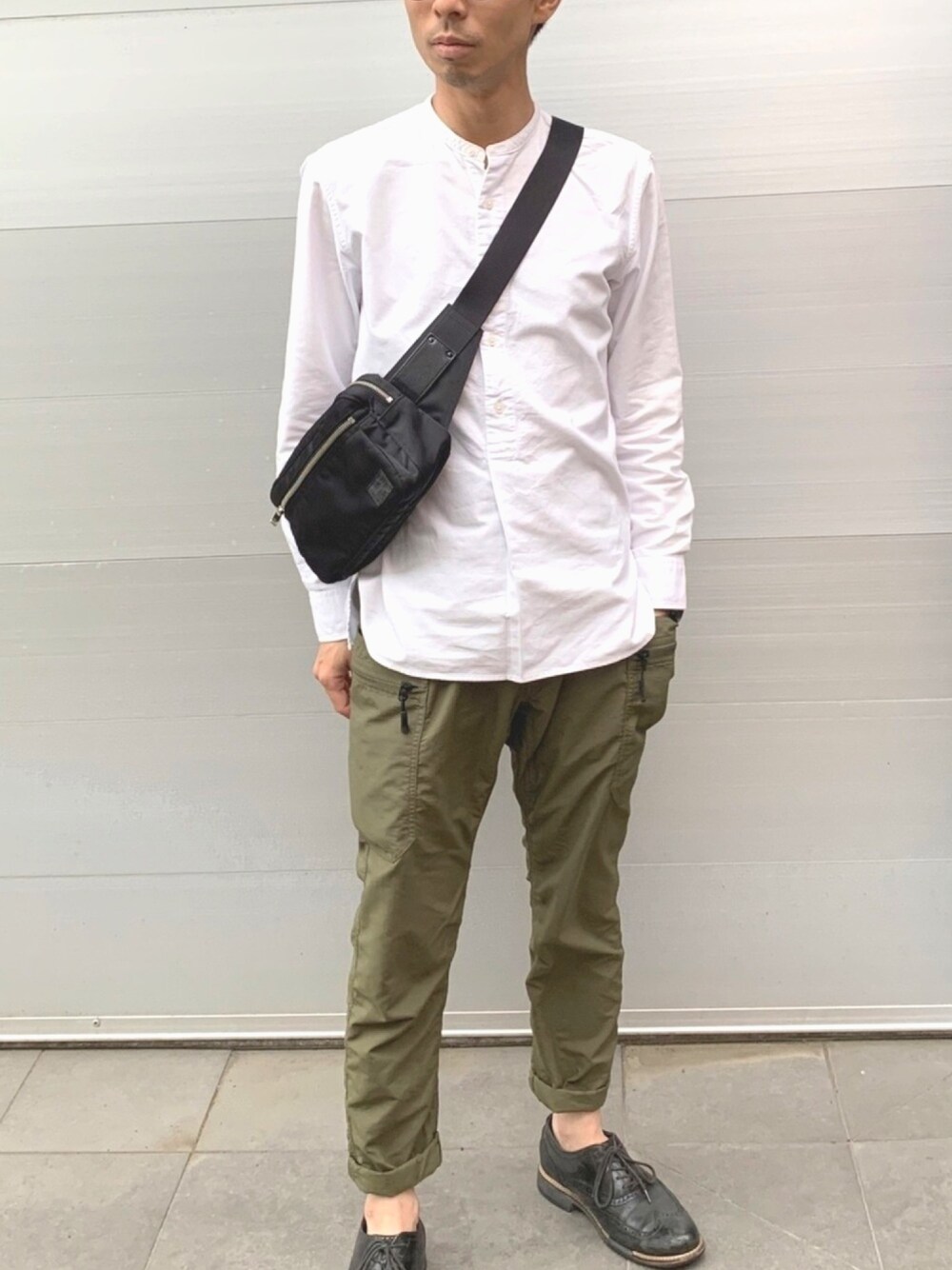 襟付きシャツよりカジュアルな着こなしに出来るバンドカラーシャツ。 ワークパンツと足首見せで、コーデに抜け感と清涼感を加えています(^^)
