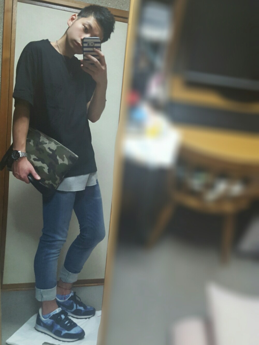 いつもありがとうございます\(^o^)/ たまにはトーンダウンさせて、暗めな色で( ´∀` )b 基本的に明るい色が好きだから、暗い色ってあまり着ないのだけれど。 なんとなーく!笑 黒のビッグTにグレーのレイヤード。 そして、青のスキニーで合わせてみました!! やっぱりポイントはスニーカーとクラッチのカモフラリンク?(^^) 案の定、今日はめっちゃ暑かったので外はみーんな明るい涼しそうな色ばかり。 地味な色が逆に目立ちました(/´△`\)← 今日はお昼ご飯をお店で食べました。 日替わりランチがオススメとゆうことで、値段も内容も気にせずに 「じゃあ、それください。」 この、何が出てきても受けて立つ感が僕にとっての勇気の表れ。←どうでもええ 出てきたものは、照り焼きチキン定食。 まあ、それは普通に好きなものやったのですが… 横によく添えてあるパセリ。笑 これって、一番食べ残しの多い食材みたいなんですよ。 確かに味は美味しいことはないですが、生産者の気持ちを考えてみれば、毎日丁寧にお世話してくれているのにかわいそう。 そんなことを考えるくらい優しいんです。←自分で言うな それに同じ業界のものとして、食べ残しはあまりいい思いはしないので!! 僕は食べます!! パセリを!僕は食べます!!!笑 そんなこんなで、周りをふらーっと見ているとボトルキープがいっぱい。 目の前のボトルには………ん?笑 HENTAIさん?( ゚Д゚)← なにこれ笑 どこのヘンタイさんなんですかね?(;´∀`) 逆にこの人、よくその名前でキープしましたよね! 世間にはこうゆうユニークな人もいるんですね笑 そしてそして、髪を切って約一ヶ月でここまで伸びるスピードが早いヘンタイさんがここにもいました\(^o^)/←