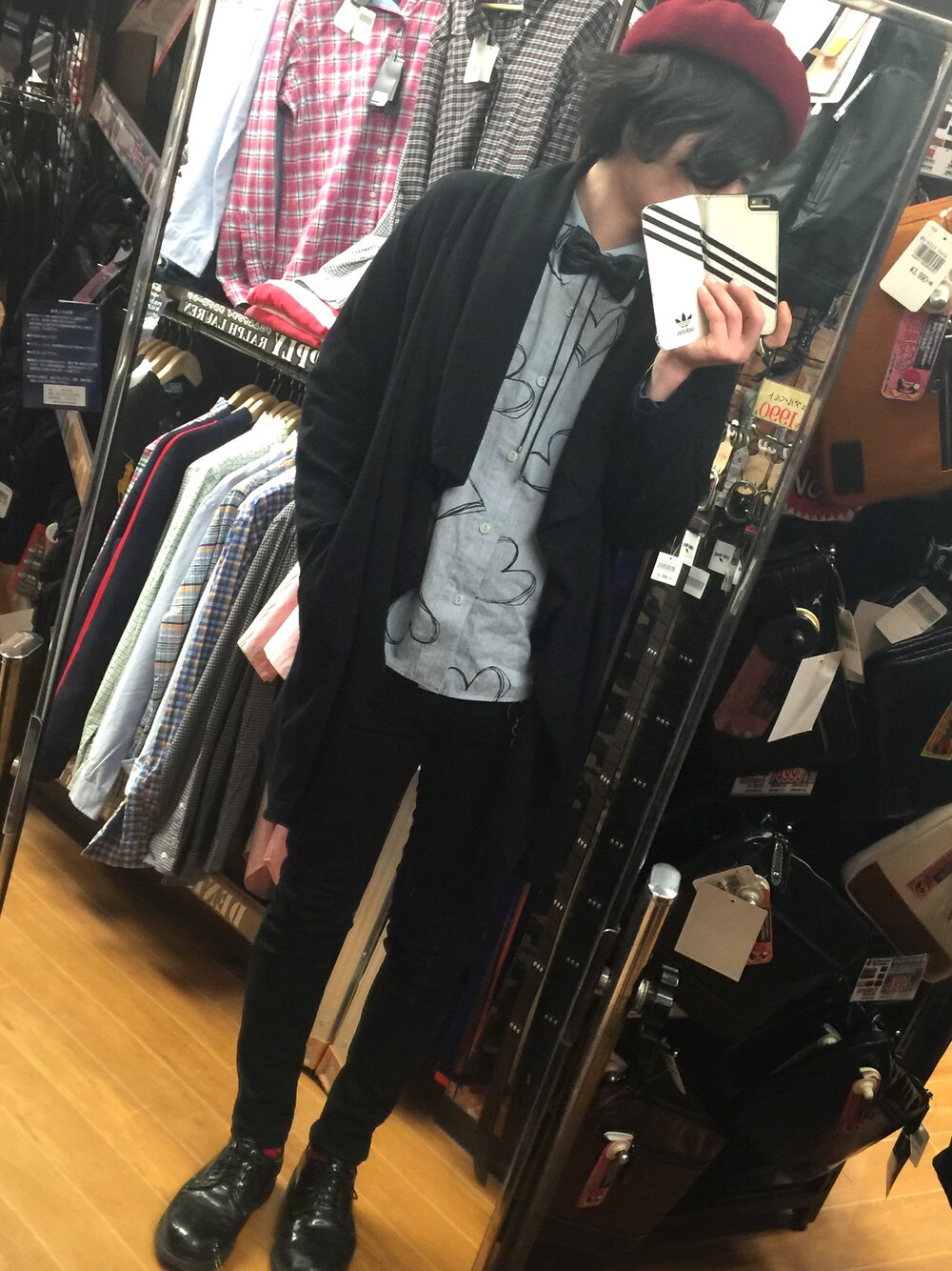 春コーデでMILKBOYのシャツをメインに他は抑え目に黒とベレー帽とソックスは差し色で赤にまとめました。