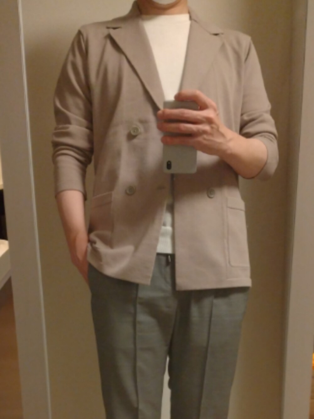 10月中旬 気温18〜23℃ HILTON戸賀ニットジャケット(グレージュ Mサイズ) インナーは半袖(白 Mサイズ) パンツはセレクトショップring別注のシャカウール(グレー 46サイズ) 気をつけないと老け見えするグレージュ+グレーの合わせ。袖まくりで抜け感を出すことで老け見え回避。 足元は軽快さをプラスするスニーカー(白か黒のレザー)で。