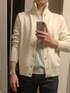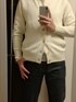 ご覧いただきありがとうございます。 10月末 気温16〜20℃ 5ゲージニットブルゾン(カーディガン)48サイズ ホワイト(オフホワイト系) インナーはコットンニット(Lサイズ ライトグレー) デニムはセルビッチスリムフィット(31インチ インディゴ) 靴はダークブラウンスエードのベルジャンシューズ