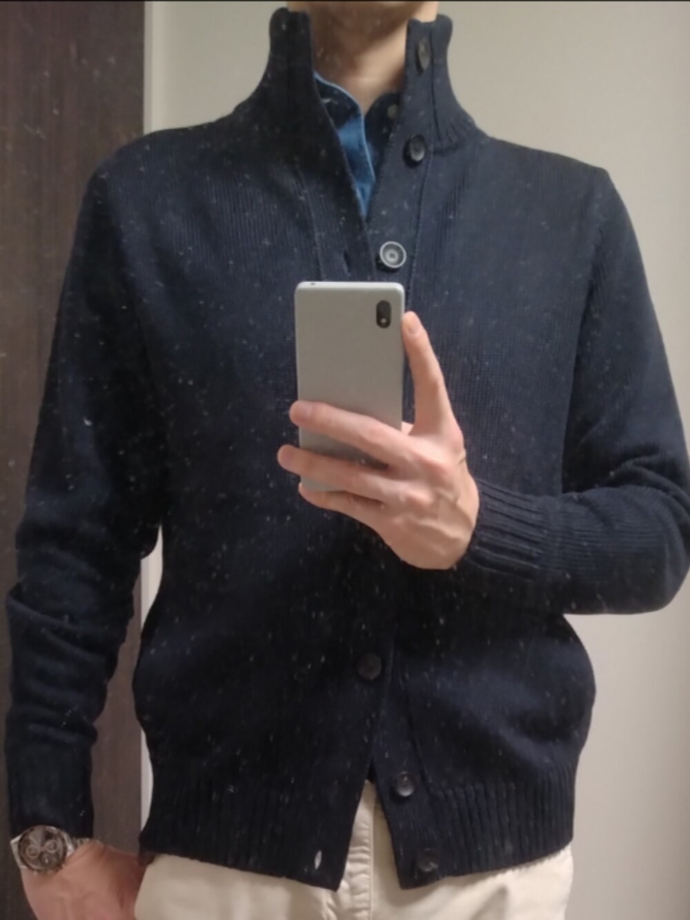 ご覧いただきありがとうございます。40代以上の男性向けに発信しています。 12月下旬8〜12℃ ニットブルゾン(5Gカーディガン)(48サイズ ネイビー) シャツはダンガリー(Sサイズ インディゴブルー) パンツ(32サイズ オフホワイト)ワンサイズ下げたほうが腰周りがスッキリしてカッコいいと思う パンツの長さはくるぶしが隠れる位。長いと野暮ったくなってしまう シューズはスエードローファー(ダークブラウン) この上にキャメルのポロコート(ユニバーサルランゲージ)を羽織って、マフラーはライトグレー、グローブは靴に合わせてダークブラウン ニットをメインにリラックスした雰囲気を出したいときのコーディネート パンツをウールスラックスに替えることできれいめ度を上げたコーディネートもできる 色落ちしてないインディゴデニムに替えるとさらにカジュアルダウンできる