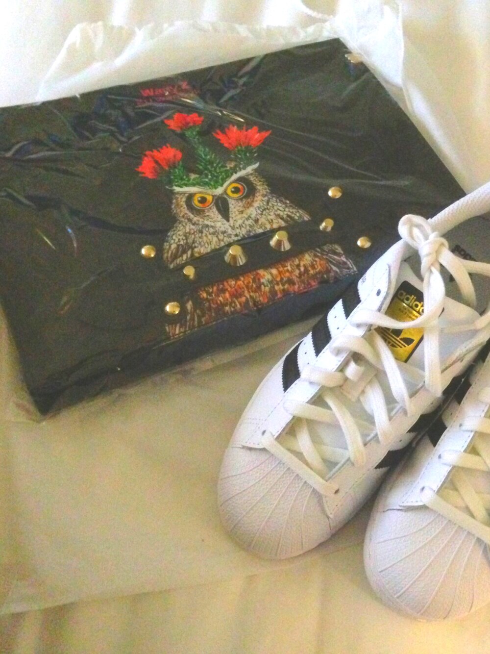 去年の春になりますが、その当時はスーパースターのサイズが国内に売り切れで無くて、韓国行った時やっと見つけて買った。バッグはあまりの個性に一目惚れしてかったやつ。クラッチにもショルダーにもなる。違う柄も欲しい!