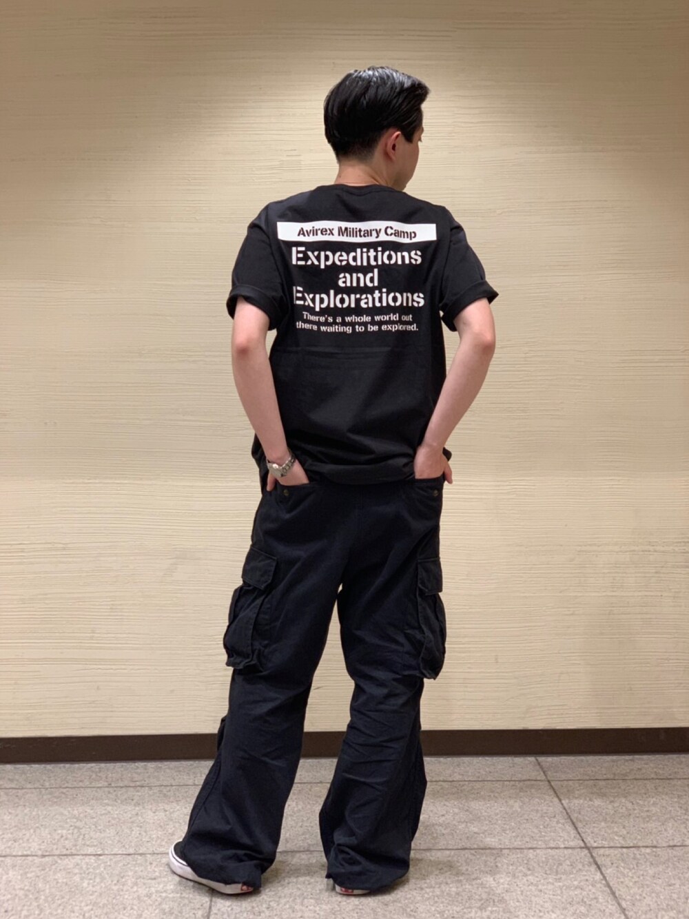 ブラック系のTシャツ/カットソーを着用したメンズの夏コーディネートの1枚目の写真