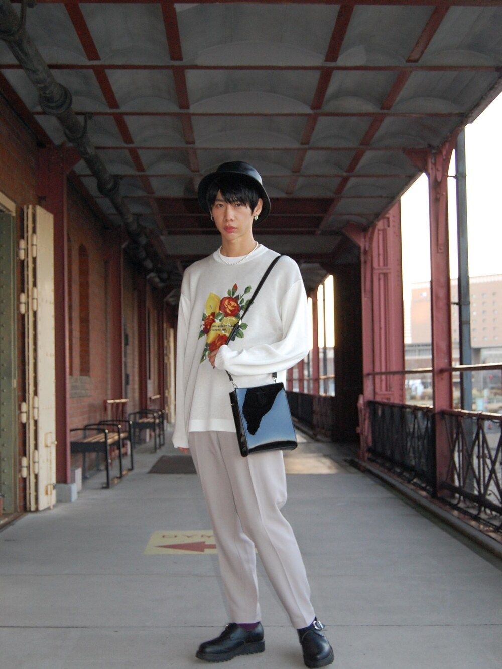 今回のスタイリングは、印象的なフルーツ柄のニットをメインにおいた春スタイリングです。 カラーは全体を明るめで合わせる事でカラフルなニットを主役にしています。 明るめだけで合わせると可愛くなり過ぎちゃうのを小バケットハット、バック、シューズと黒で統一しメンズらしさを演出してみました。