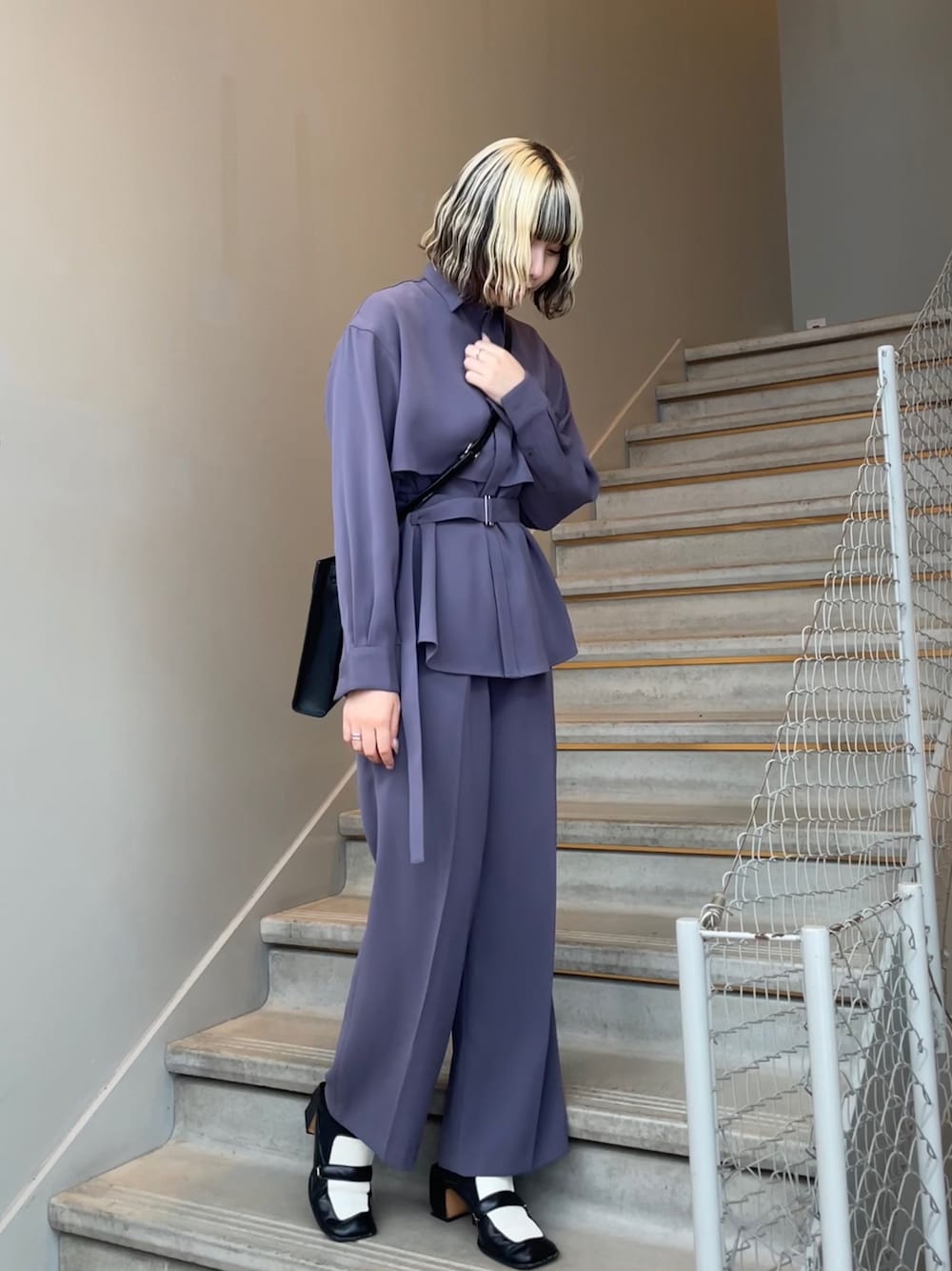 トロミツイルシャツ、シャツにタイロッケンのベルトが付いているので絞りや、たらしで着回しできるのがポイント!私はセットアップでコーディネートを組んでみました。
