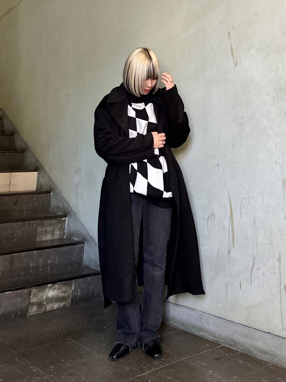 モード感のあるニットにゆったり着ていただけるビックシルエットコートをあわせました!全身ブラックで統一してかっこいい雰囲気のあるコーディネートにしてみました。
