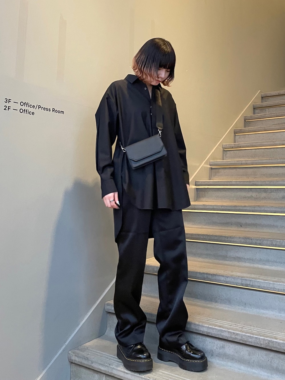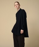 細部までこだわりのあるバックボタンシャツ。一枚でシャツとして着る、またライトアウターのような羽織で着る、など様々な着方ができるのでおすすめです。今回はオールブラックコーデにしてみました!
