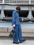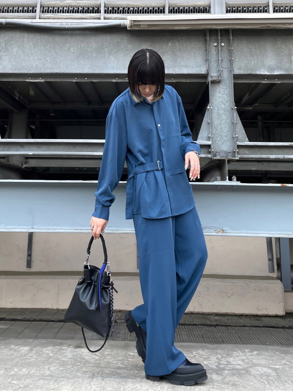 セットアップ可能商品をセットアップで着用してみました。レザー巾着ショルダーバッグを差し色でプラスしてモード感のあるコーディネートにしてみました。