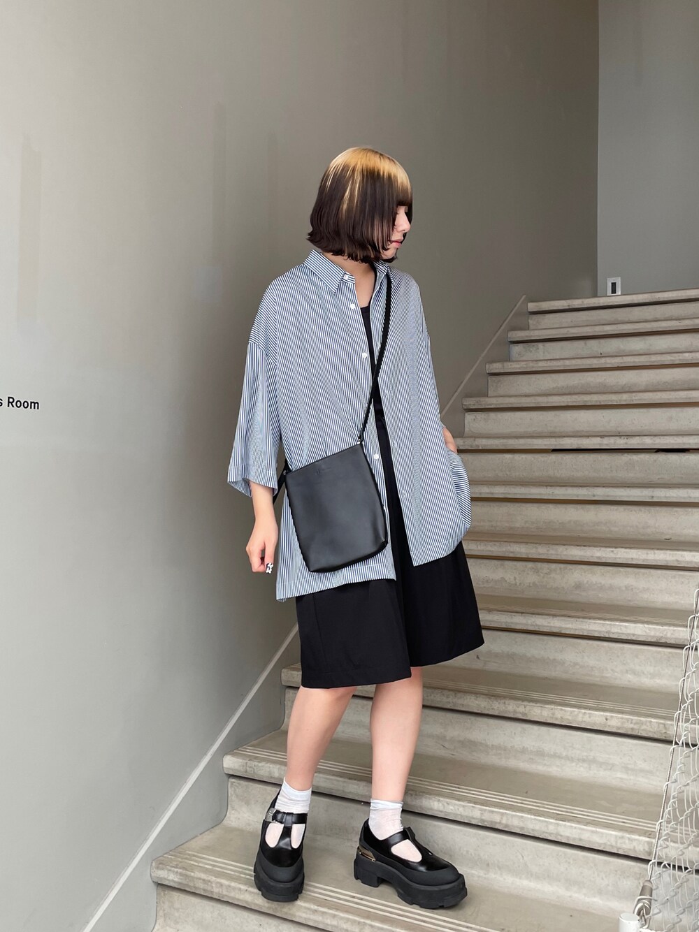 なめらかストライプシャツ。さらっとした着心地でこれからの季節にぴったりなアイテムです!シャツ×ハーフパンツで綺麗目活、カジュアルなコーディネートにしてみました!バッグはWEB限定のリアルレザーショルダーバッグです!