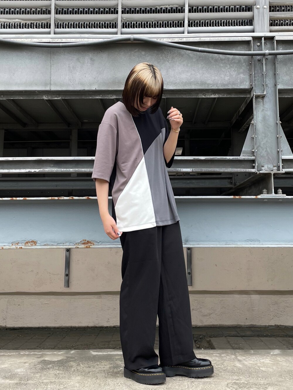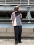 フロントの切り替え配色がデザインあるカットソー。ジャージのような着心地なのでとても動きやすいアイテムです!トップスはL、パンツはSで着用しています!