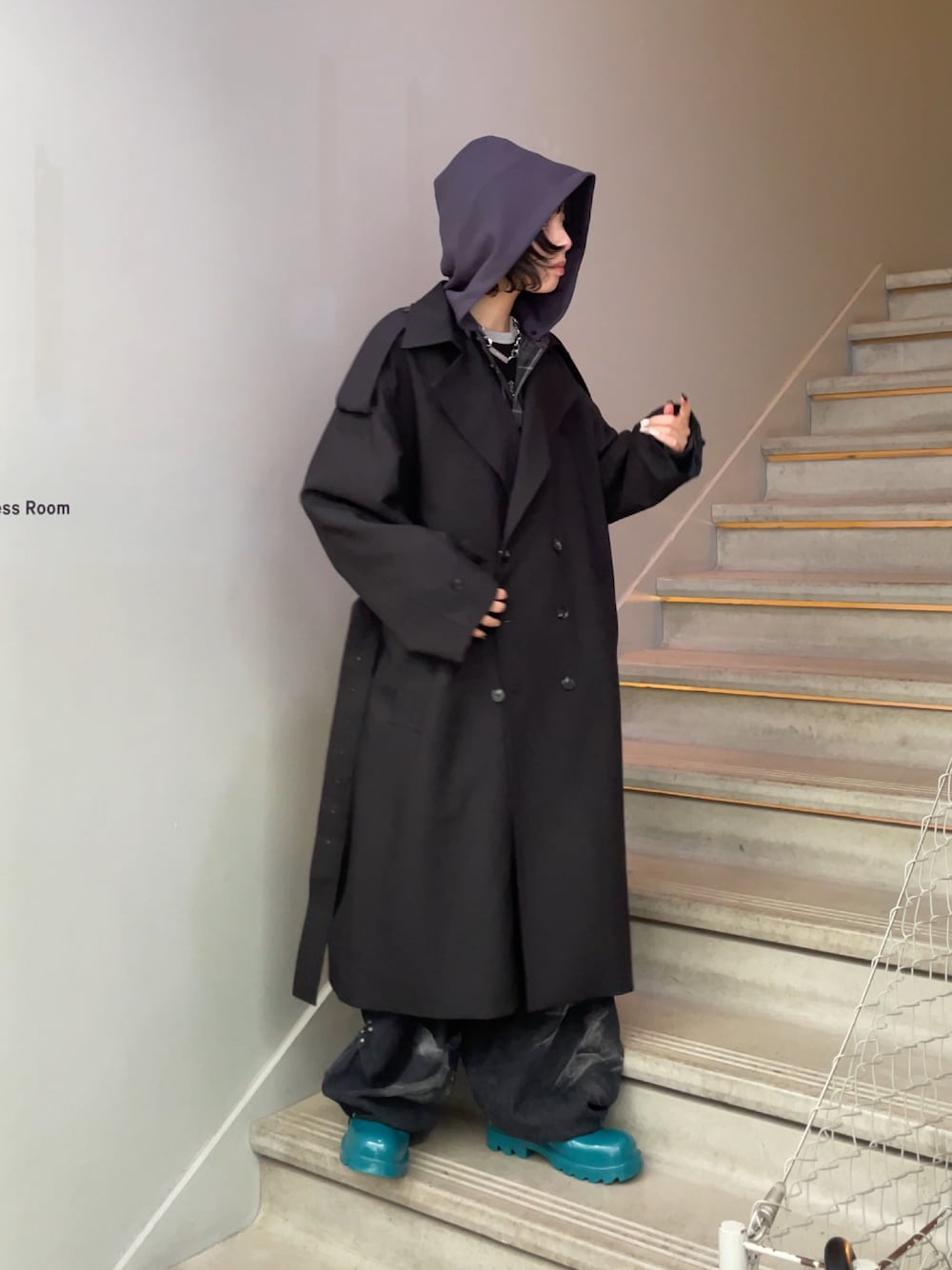 クラシカルなディテールを取り入れたオーバーサイズシルエットのトレンチコートを使った綺麗めカジュアルコーデ。 コートはSサイズを着用しています。