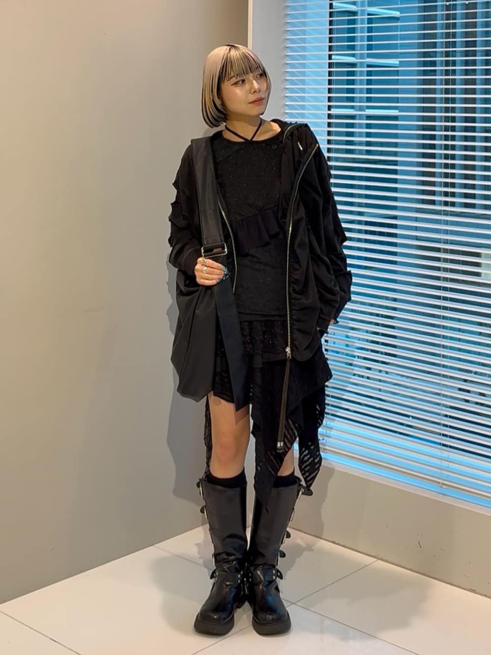 K'のPJT by AOI『Lightweight Parka』を使ったコーデ。 前見頃のセンターパーツは取り外し可能になっています。 今回はパーツを外した羽織のスタイルでモードコーデに! サイズは66サイズを着用しています。