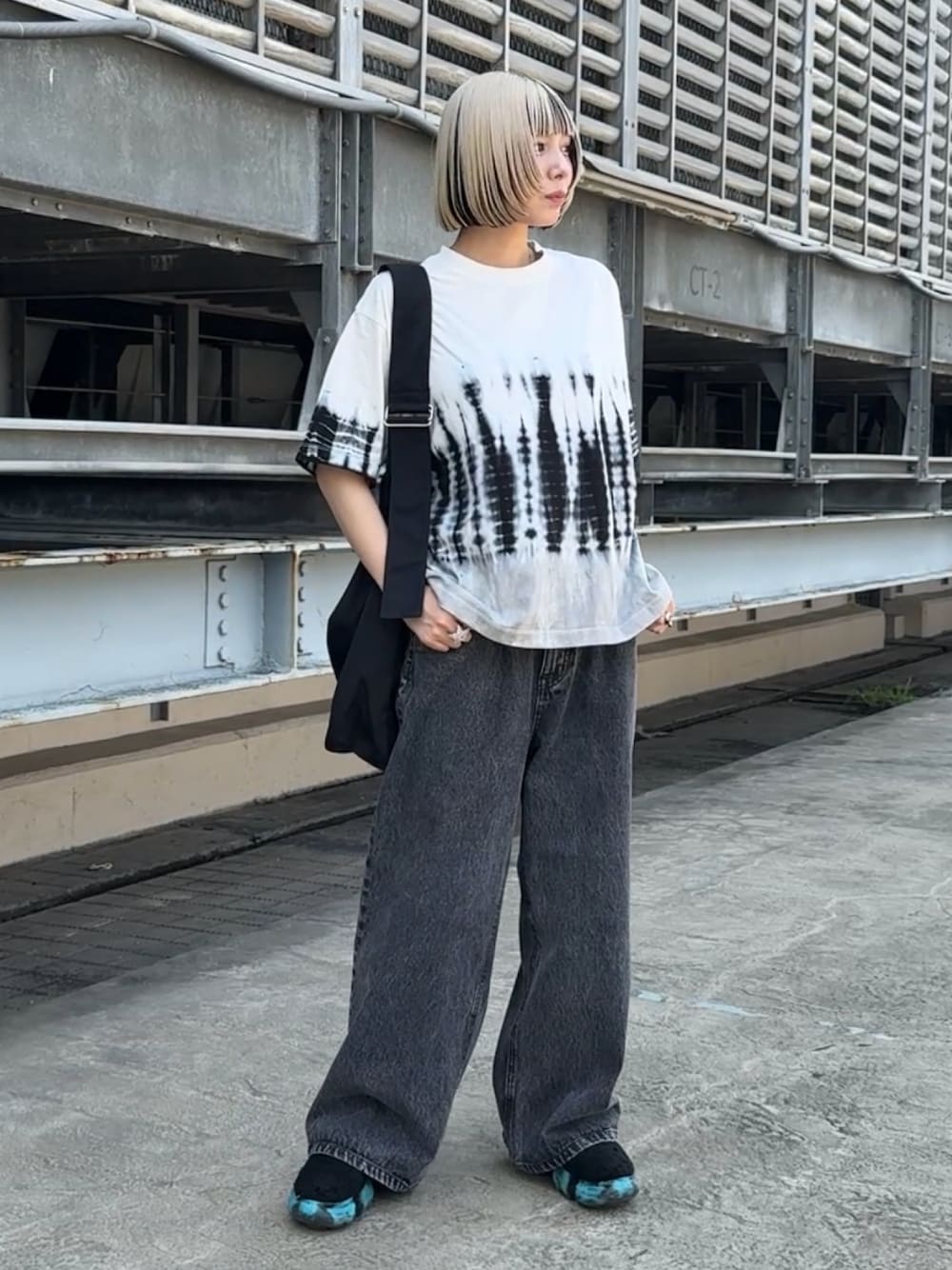 3つのカラーを使ったタイダイTシャツを使ったコーデ。 サイズの展開が幅広く、ユニセックスで着用できます! オーバーサイズながらも、着丈や裾周りなど細部を調整することでクリーンな印象に! デニムと合わせることでカジュアルなコーデにもなり、おすすめです◎