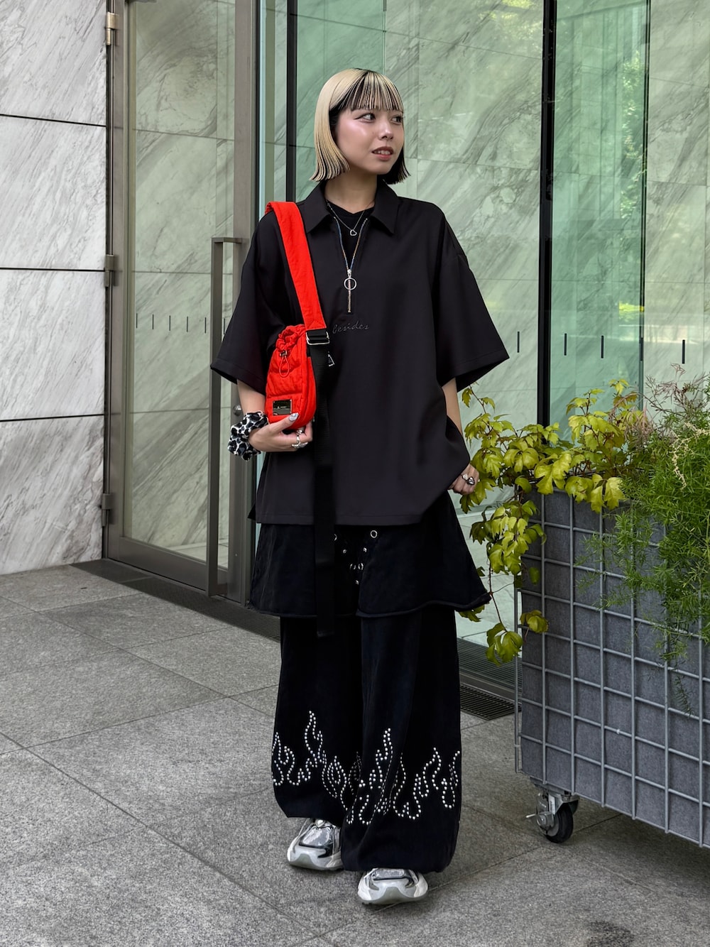 ブラックコーデに差し色でオレンジのバッグを+ バッグは、パフィーシリーズの新型を使ってみました! 夏はラフにお洒落に行きたいので、こちらのバッグもオススメです。