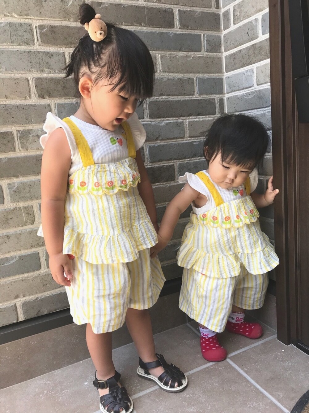 おそろいでセットアップ風に♡ プチジャムの子供らしいデザインも好き♪ 一目惚れで買ったくまさんのヘアゴムを 長女の頭につけてあげると、 次女が大喜び(^o^)♡