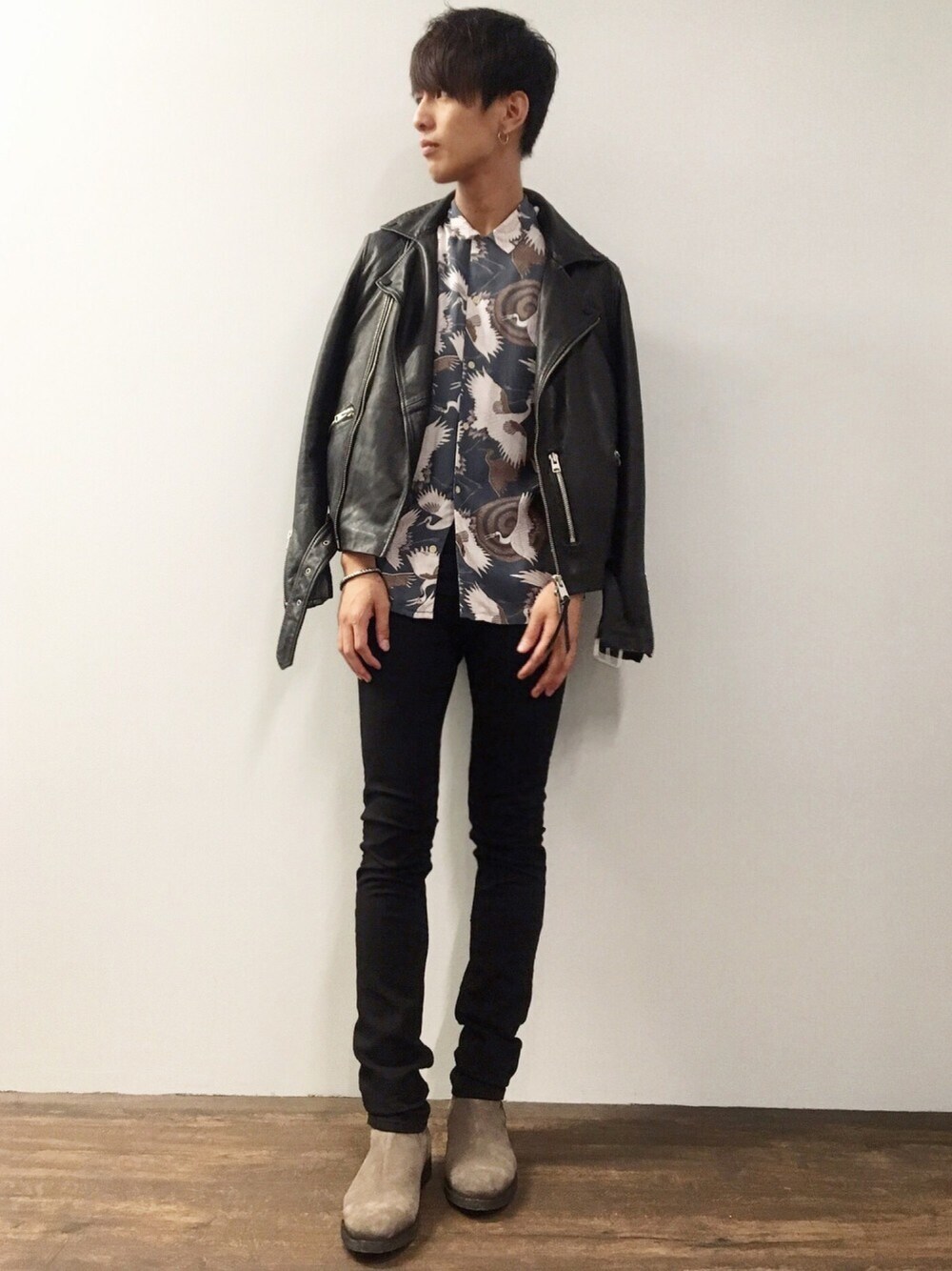 レザーに柄シャスを組み合わせたシンプルなオールセインツスタイル。