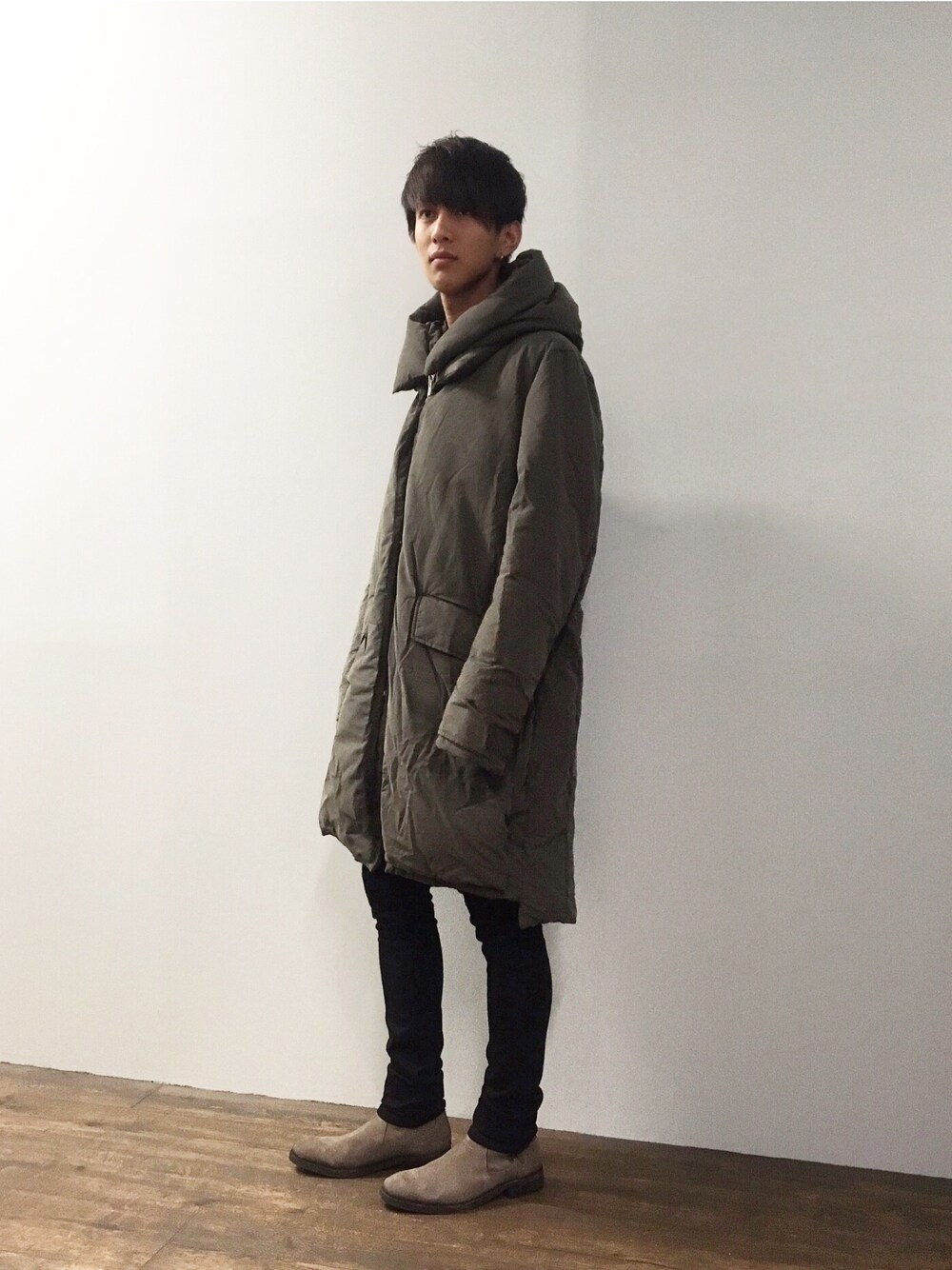 シンプルだからこそ一着が映えるコーディネート。スウェードで重すぎない印象に。