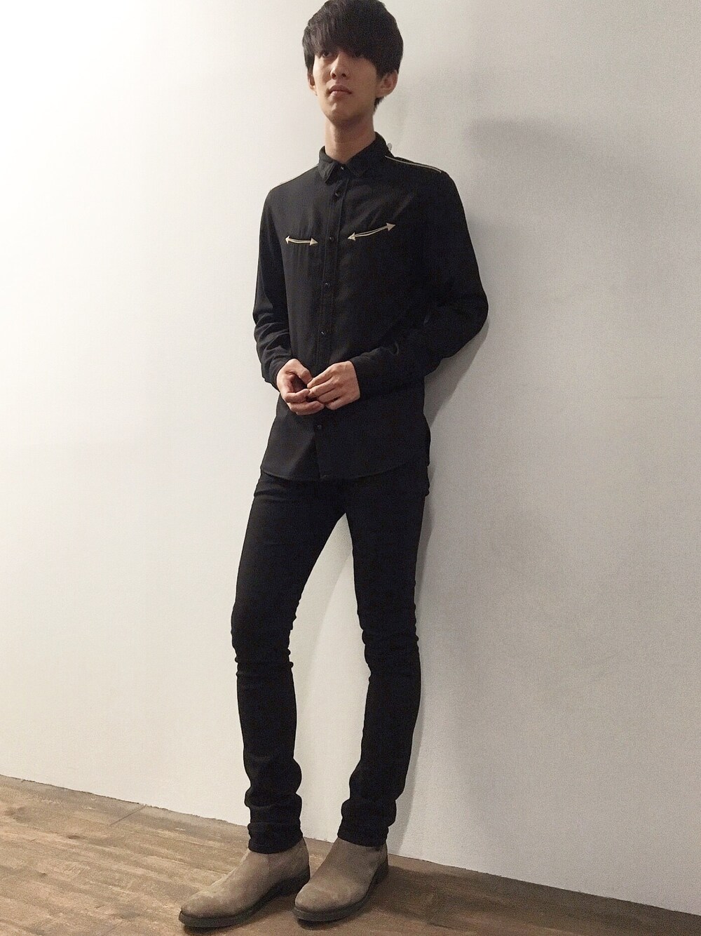 地厚なレーヨンのシャツの光沢で上品なイメージをプラスしつつ、ブラックスキニーでロックなストリートのイメージを残したモードスタイリング。