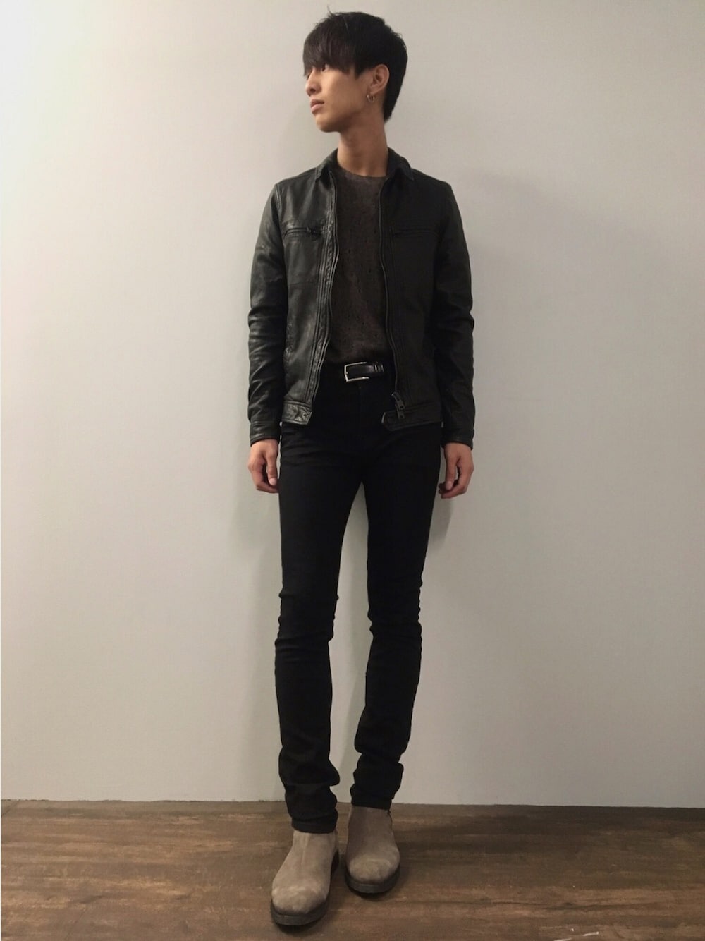 ブラックスキニーにシングルのゴートレザーでストリートモードに仕上げ、インナーにはレオパードのニットを。インナーに柄を入れたシンプルなレザースタイル タックインするこでレザーの丈の短さ、パンツの長さの両方を活かしつつバランスを取った。