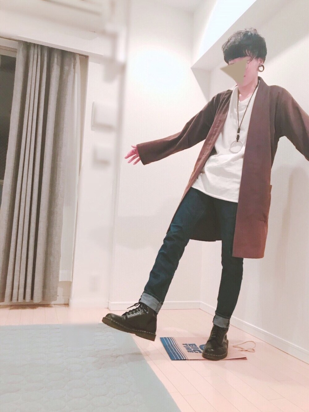 実はこの茶色のガウン、若干の青色が混ざっているのです。 古着なんですが一目惚れしてしまい購入しました。 普段デニムってあまり履かないのですがたまに履くと違った雰囲気になりいいですね。