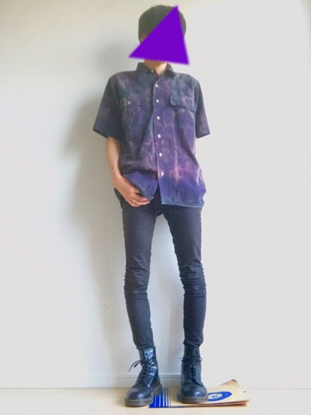 こんばんは。 古着屋で購入した柄シャツをシンプルに黒スキニーとマーチンで合わせました。 タイダイっぽいのはあまり普段着ないのですがインパクトがあっていいですね。