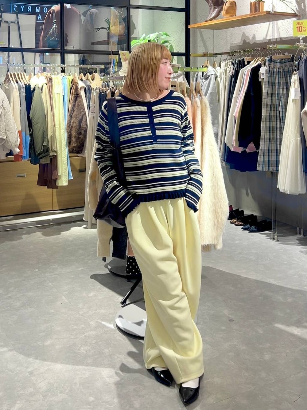 ラフコーデ! 人気のコクーンパンツに新色が出たので、 楽ちんスタイル組んでみた💛 ⭐各アイテムのおすすめポイント  ̄ ̄ ̄ ̄ ̄ ̄ ̄ ̄ ̄ ̄ ̄ ̄ ̄ ̄ ̄ ̄ ̄ 【トップス】Fサイズ 裾と袖の小さめフリルがポイントになるトップス! 柔らかいニット生地なので着心地も抜群◎ ピタッとしすぎず、程よく体型カバーもできます👏 前後2wayで着られるので、 その日の気分によって着方を変えられますよ! → 【ボトムス】Fサイズ トレンドのコクーンシルエットのスウェットパンツ! 長めでずるっと履きたかったので、 Lサイズにしました^^ オールシーズン履いていただけて、 裏地がジャージのようにツルッとしているので、 肌に張り付きすぎず履きやすいです◎ ウエストのタックがあることで、 腰回りスッキリ見えしますよ♪ → ‥‥‥‥‥‥‥‥‥‥‥‥‥‥‥‥‥‥‥‥‥‥‥‥‥ ☆御殿場店スタッフのスタイリングはこちら! →、、 ☆Instagramでも、日常を更新しています♪ →