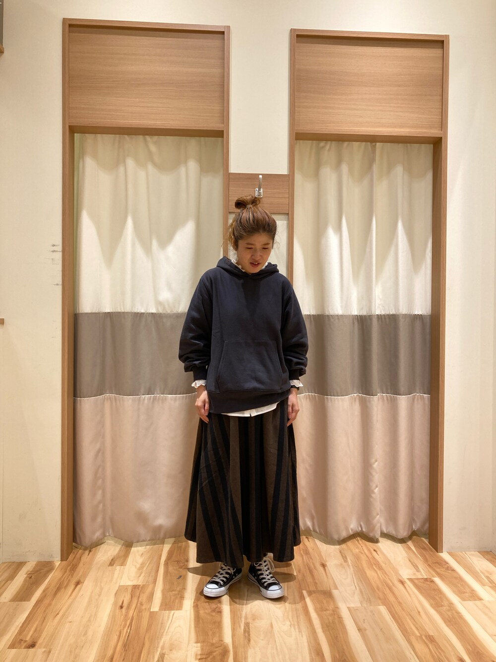 シンプルなパーカーとフレアスカートのダークトーンコーデ パーカーは裏起毛の為これからの季節に◎ レースインナーを入れて甘さを出しました🐻