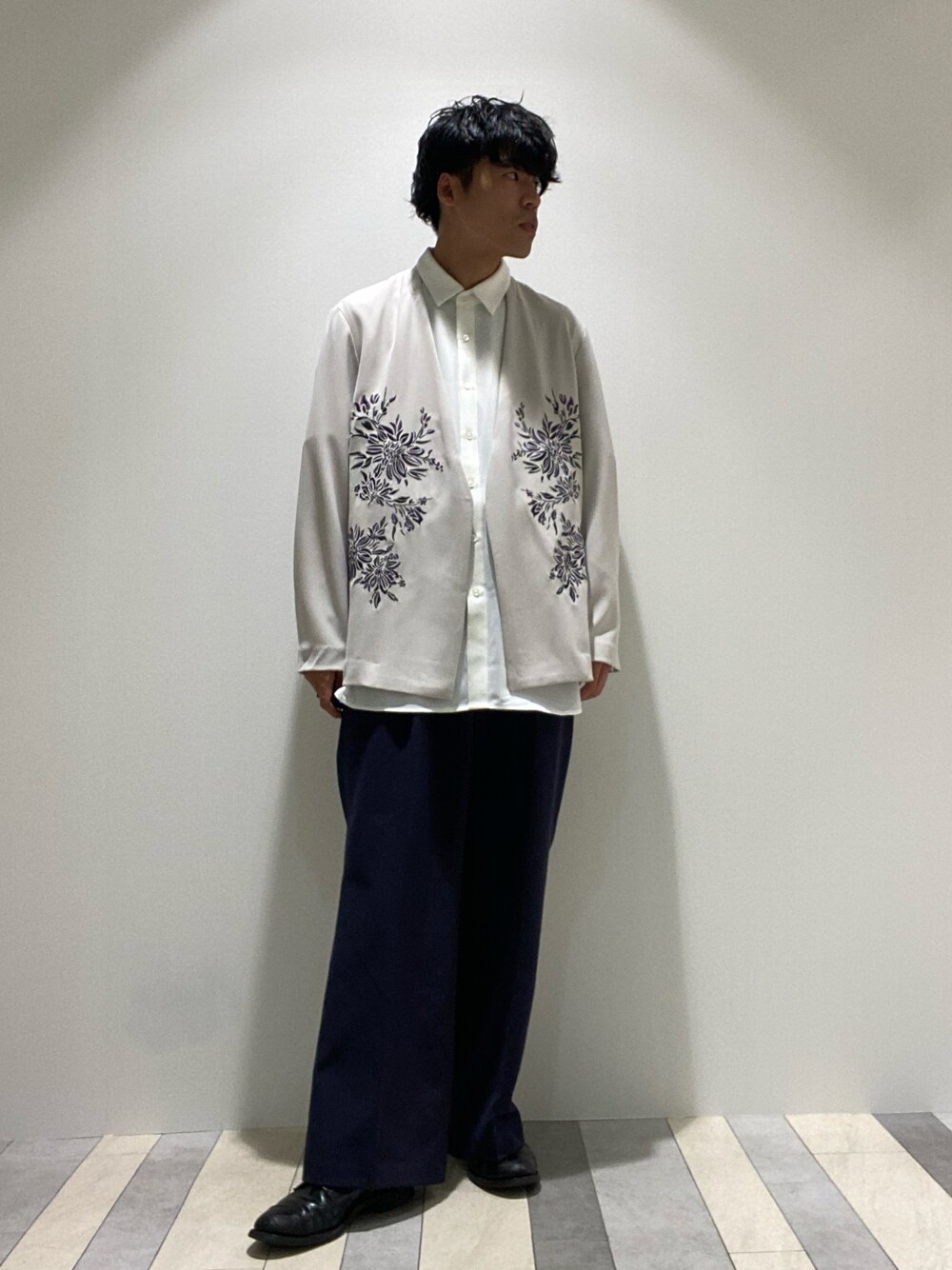 yuuuya(tk.TAKEO KIKUCHI 名古屋パルコ店)のノーカラージャケット「◆フラワーエンブロノーカラージャケット」を使ったコーディネート