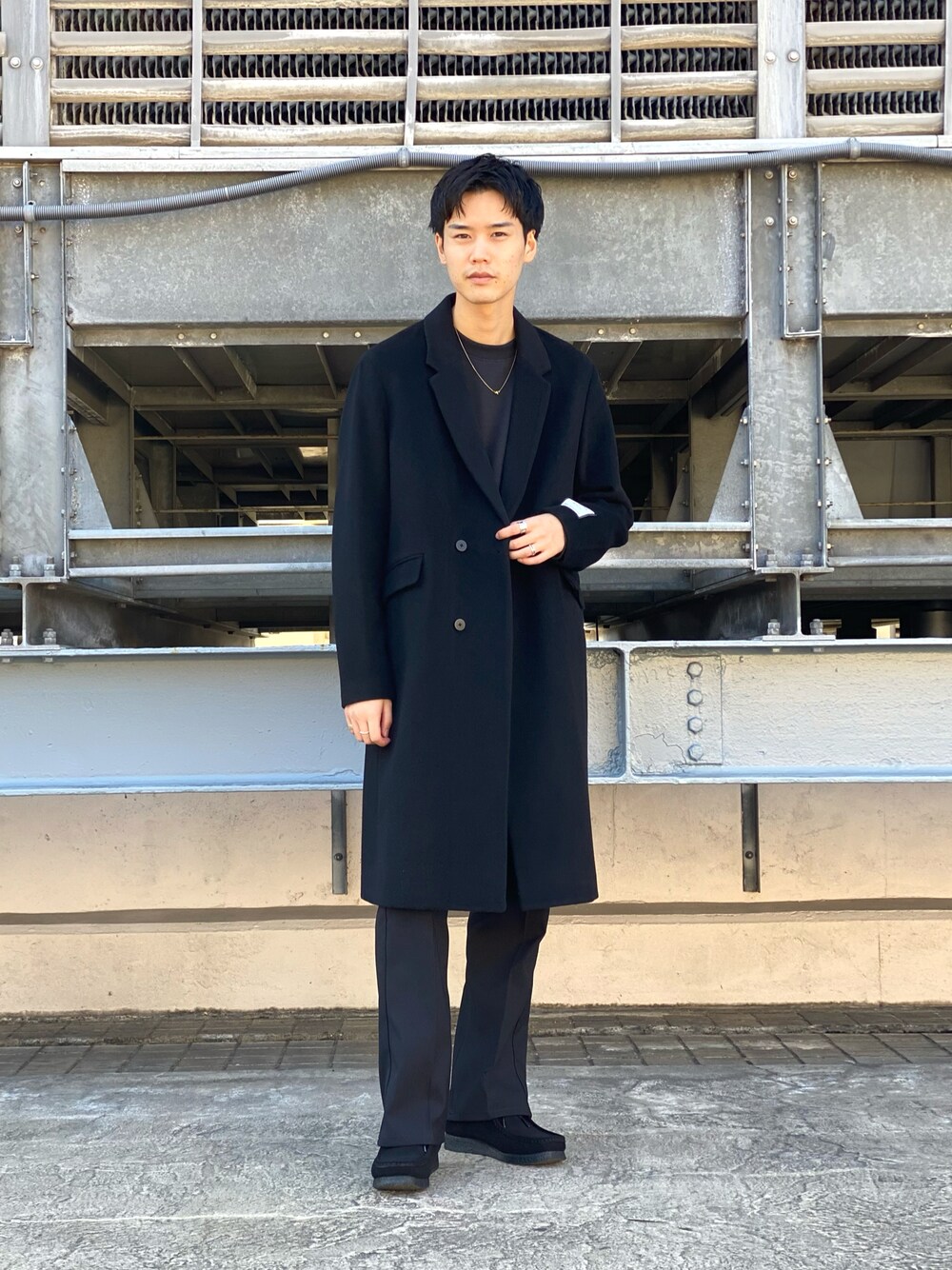 insta @kitaura_ayuta こんにちは😃 本日はスッキリとした形のダブルチェスターコートのスタイリングです! 冬に定番のロングコートをオールブラックスタイリングでお見せします! 冬なので色味は重めにしながらもパンツの形がスリムでモードに寄りすぎないように調整しました!また今回はカットソーとの合わせで首元をスッキリとさせていますが、もちろんタートルネックやマフラーなどのアイテムとも相性がいいので是非合わせてみて下さい✨