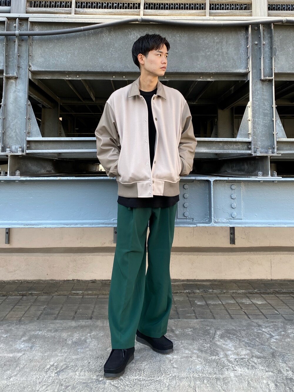 insta @kitaura_ayuta スタジャンコーデ! 襟がついていてキレイ目に見えます! キレイ目好きの僕からするとスタジャン感が強くなくすごく使いやすくて ヘビロテしてます笑 ベージュとグリーンは異色の組み合わせですが、インナーやシューズでブラックを取り入れるとすごく安定しますので是非参考にしてみて下さい!