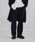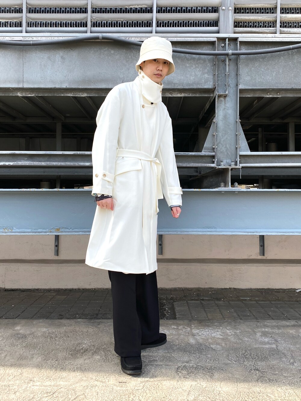 春の新作スタンドコートを使ったモードスタイリング。 襟を立てても倒しても様になるサラッとした質感のコート。 着丈も重くなりすぎない絶妙な長さで着回ししやすいシルエット。 スタイリングはモノトーンに抑え、 コートの特殊なディティールの邪魔をしないように意識しました。